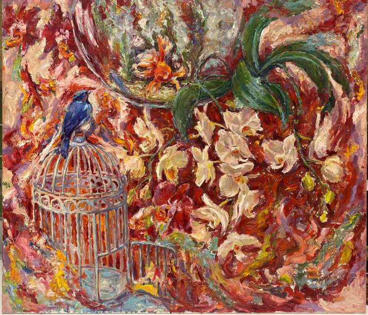 It is a portrayal of freedom and the lack thereof. The bird could escape the cage, since it can survive outside it, but the fish could not escape as it cannot survive without water. The two realms in which the bird and the fish exist are similar while also being drastically different, a difference which costs the fish its freedom and it’s liberty. It is trapped in a system in which it cannot thrive, and from which it can only be saved with the help of those who exist outside its realm. One can observe the other, however, they cannot exist within the same realm. This painting was formed with the goal of creating something rapid, spontaneous, like a flowing river on the mountain. It was made from the chaos of the strokes, as if the canvas was manipulating the flow of the strokes itself.