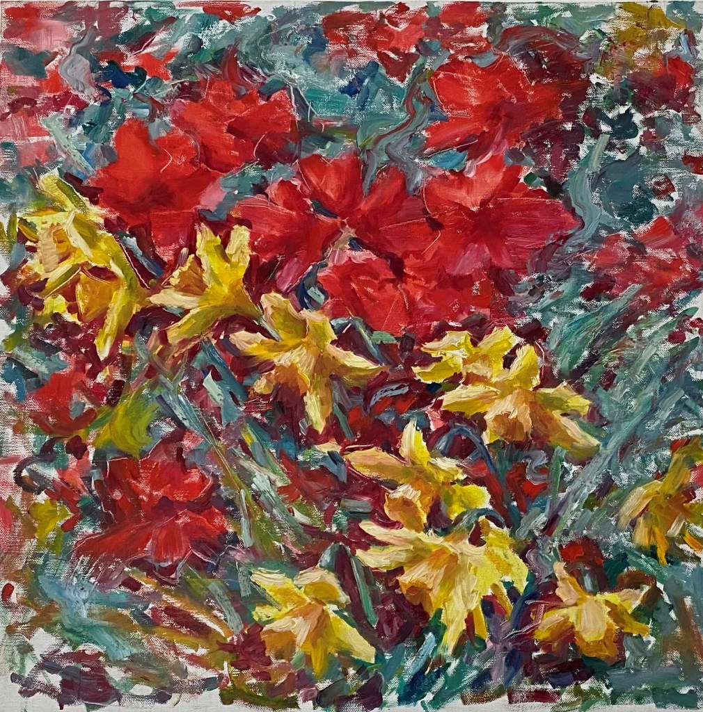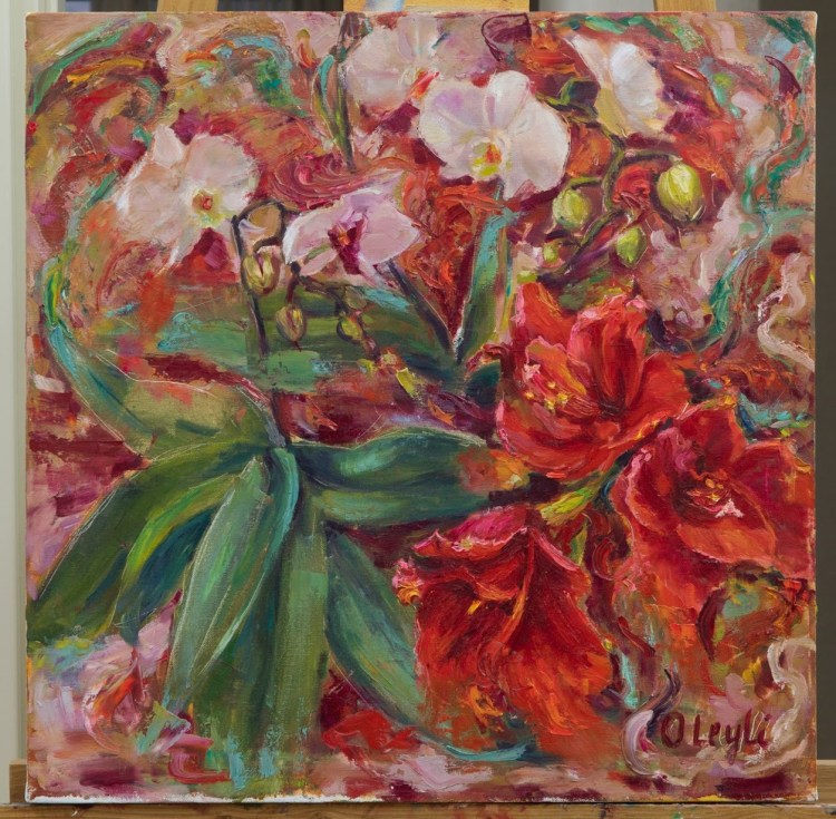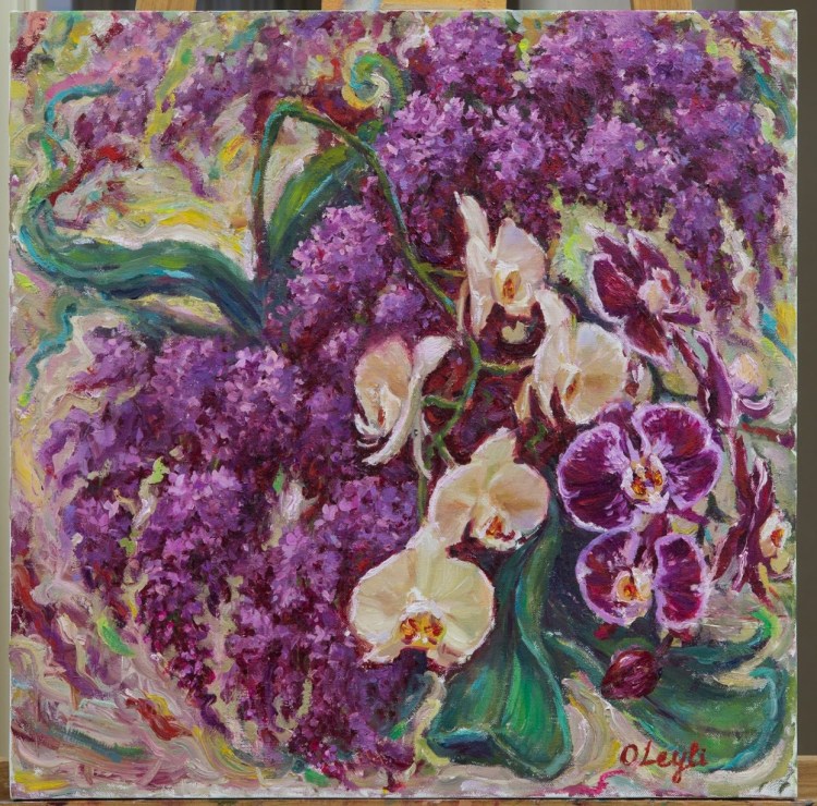 The paintings are inspired by the long lasting beauty of the orchids and the momentary blooming of the lilacs, the amaryllis and other flowers. The brushstrokes in the background flows like the time in-between the two paintings. The red painting was made in the last month of the winter, and the lilac was made in the spring with the same orchid which were still in bloom. Orchids are my favourite flowers, as they last long and give you all the love that is possible.