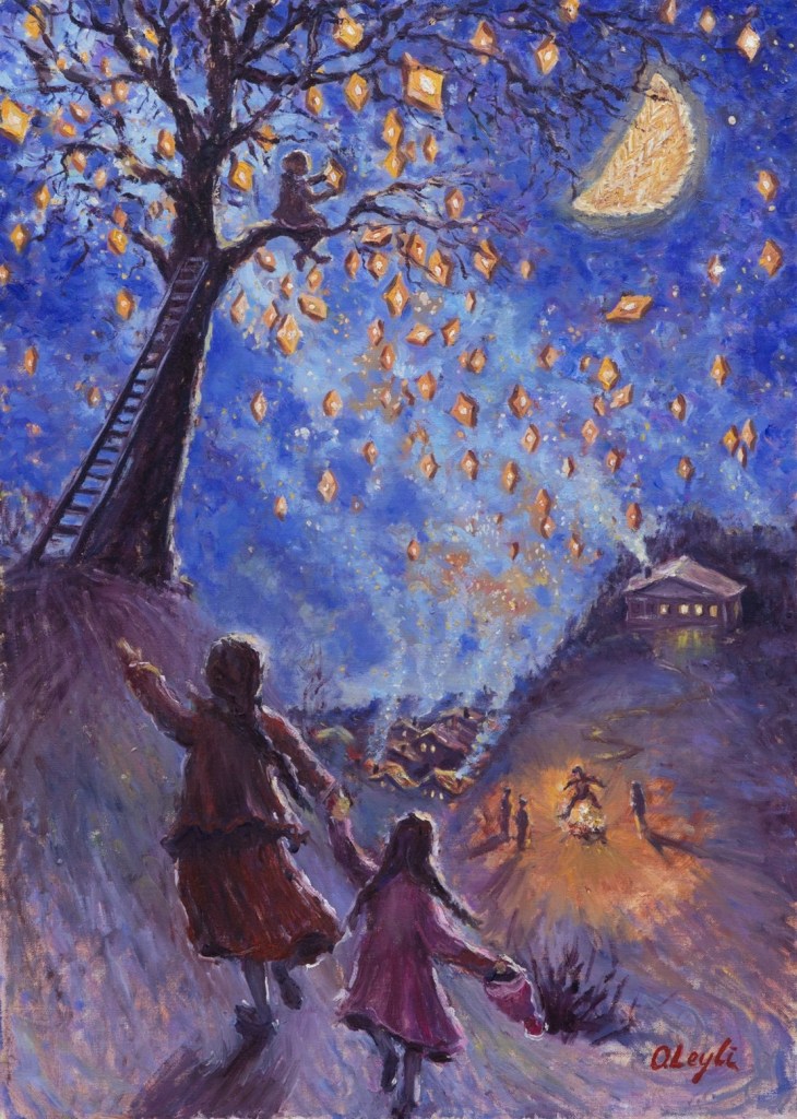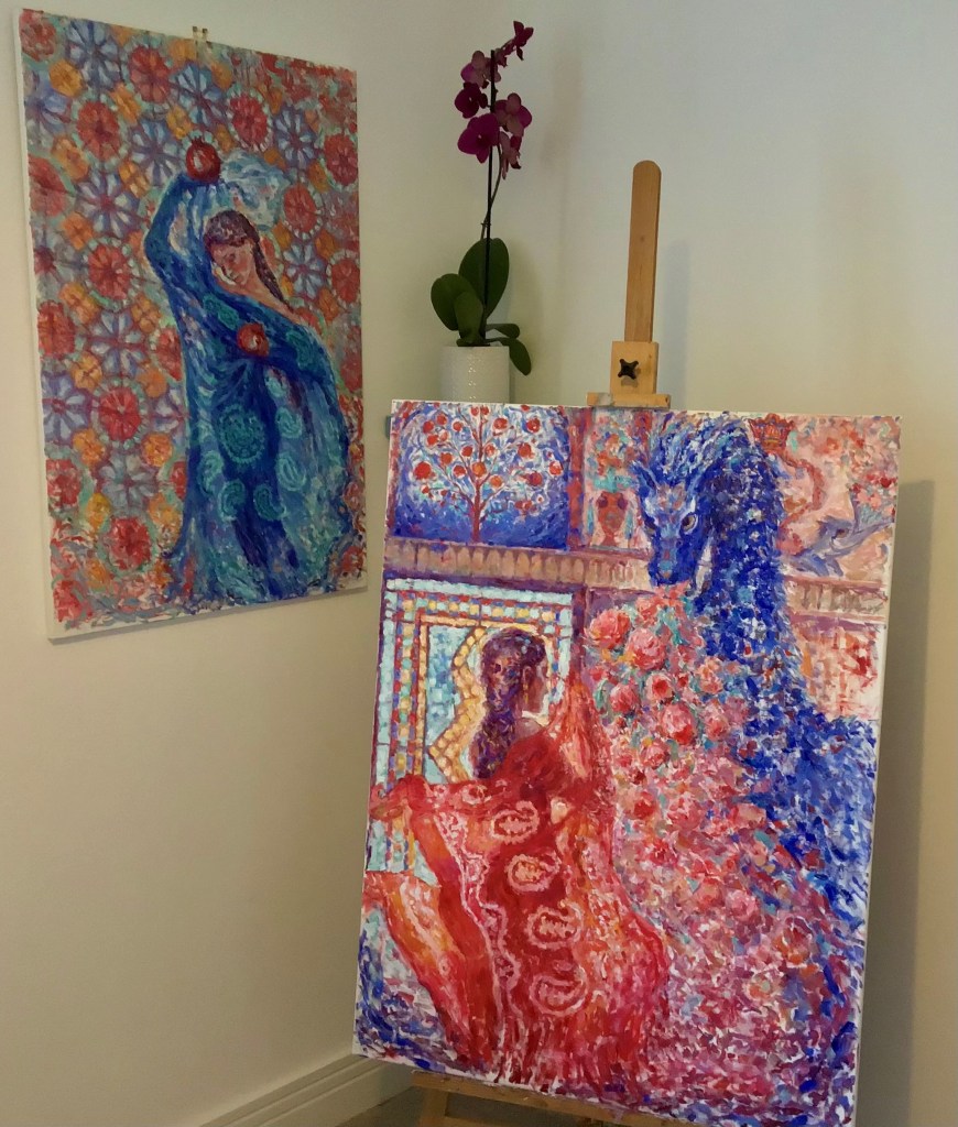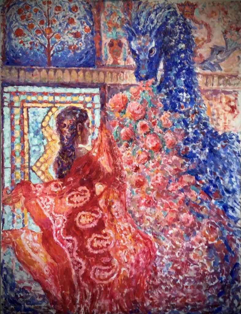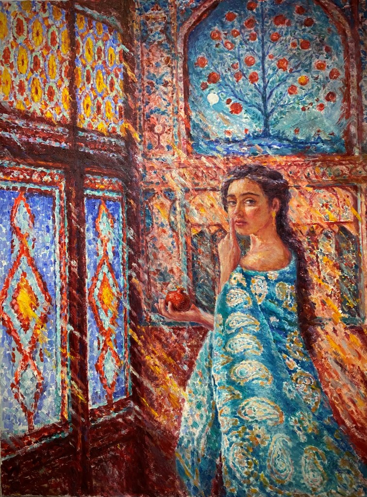 The paintings in my Sheki collection are various scenes depicting her exchanges with the murals, and how when another observer walks in the room, the illustrations fall promptly into place, or materialise as a quick disguise. One of such murals was that of a dragon regurgitating flowers- a symbol of the nobility of the Khan which I displayed in my work “The dragon”. Moreover, the girl holding the scarlet Kalaghai – a silk scarf decorated with traditional patterns, the production of which Sheki is renowned for, represents love and wisdom. Furthermore, in the work “secret”, the murals of pomegranate trees with bright fruits signify abundance and propagation. In my paintings, I wanted to emphasise the phantasmagorical light shining through the windows and doors, which are skilfully assembled from pieces of wood and coloured Venetian glass.