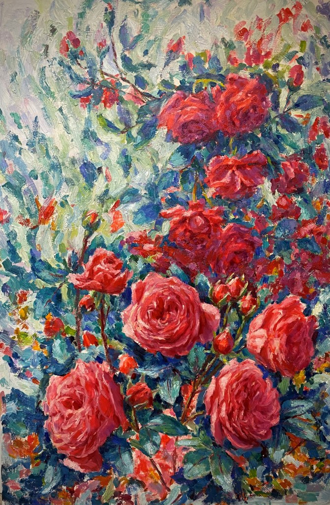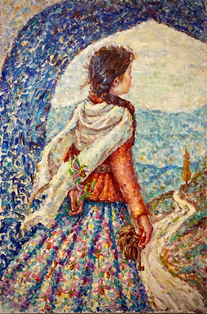 The keys which are held by the girl in the painting “The Key”, are the infamous keys to the Ganja gates to the Shusha fortress, and are stored in Baku. I painted this work during the liberation of Shusha from occupation. The storage of the aforementioned keys symbolise our historical right to this fortress. The girl is holding the key, looking from the Ganja gate of the Shusha fortress into the distance, awaiting victory.